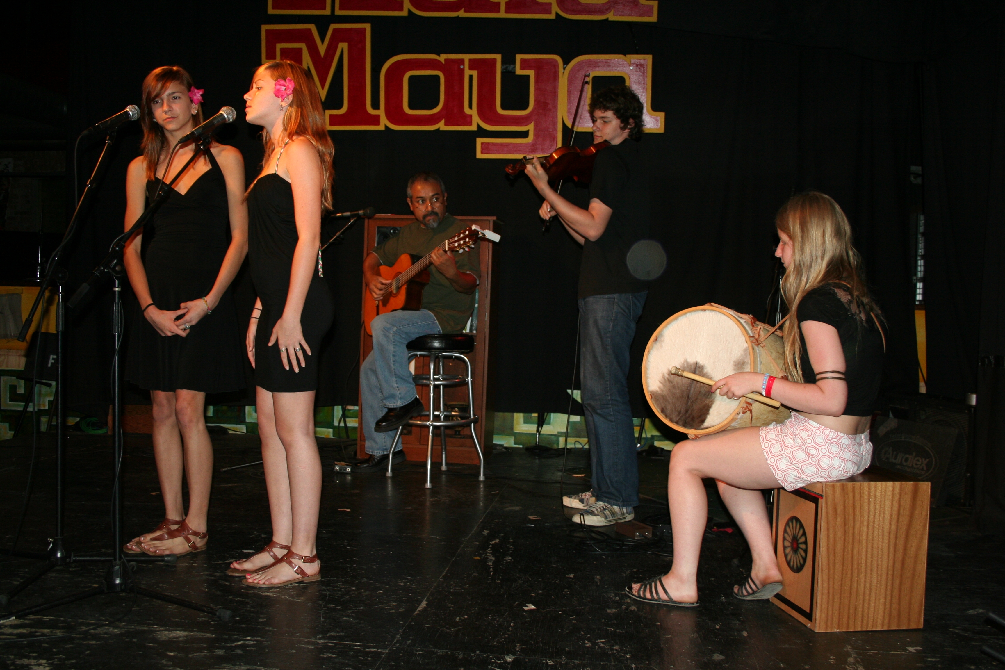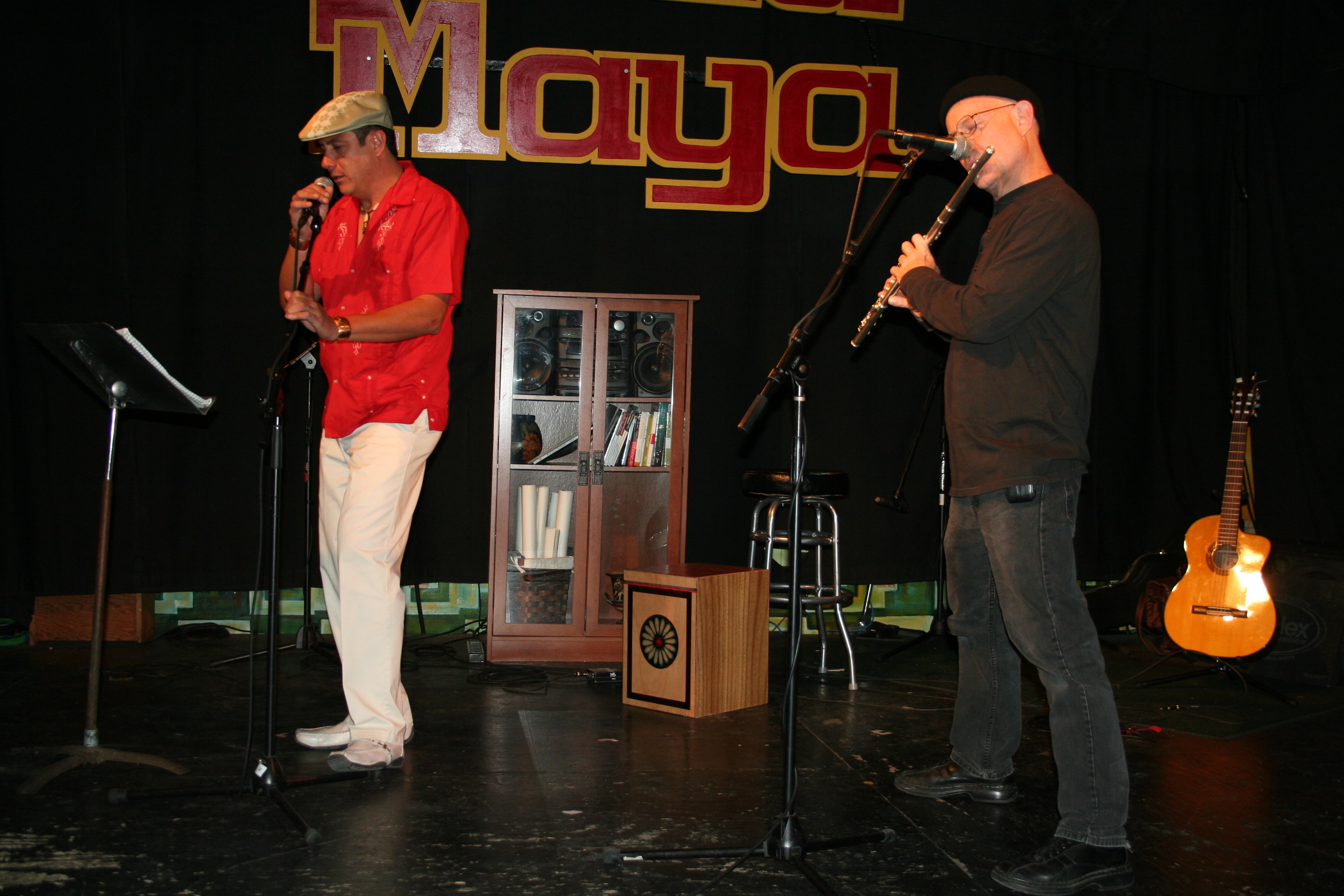 A la marcha del programa se fueron integrando más cantores como el dueto “Chia”, conformado por un Mexicano y un Alemán, cantando en Español –voz y guitarras- . Declamadores que ya son de casa: Andrea Neri y Marvin Barrantes. La música y voz del ensamble de vientos, cuerdas y voces como él que han formado Mauricio Callejas y un grupo de músicos muy completos que ejecutan: Cuatro venezolano, flauta, quena, zampoñas y guitarra, a más de armonías vocales.