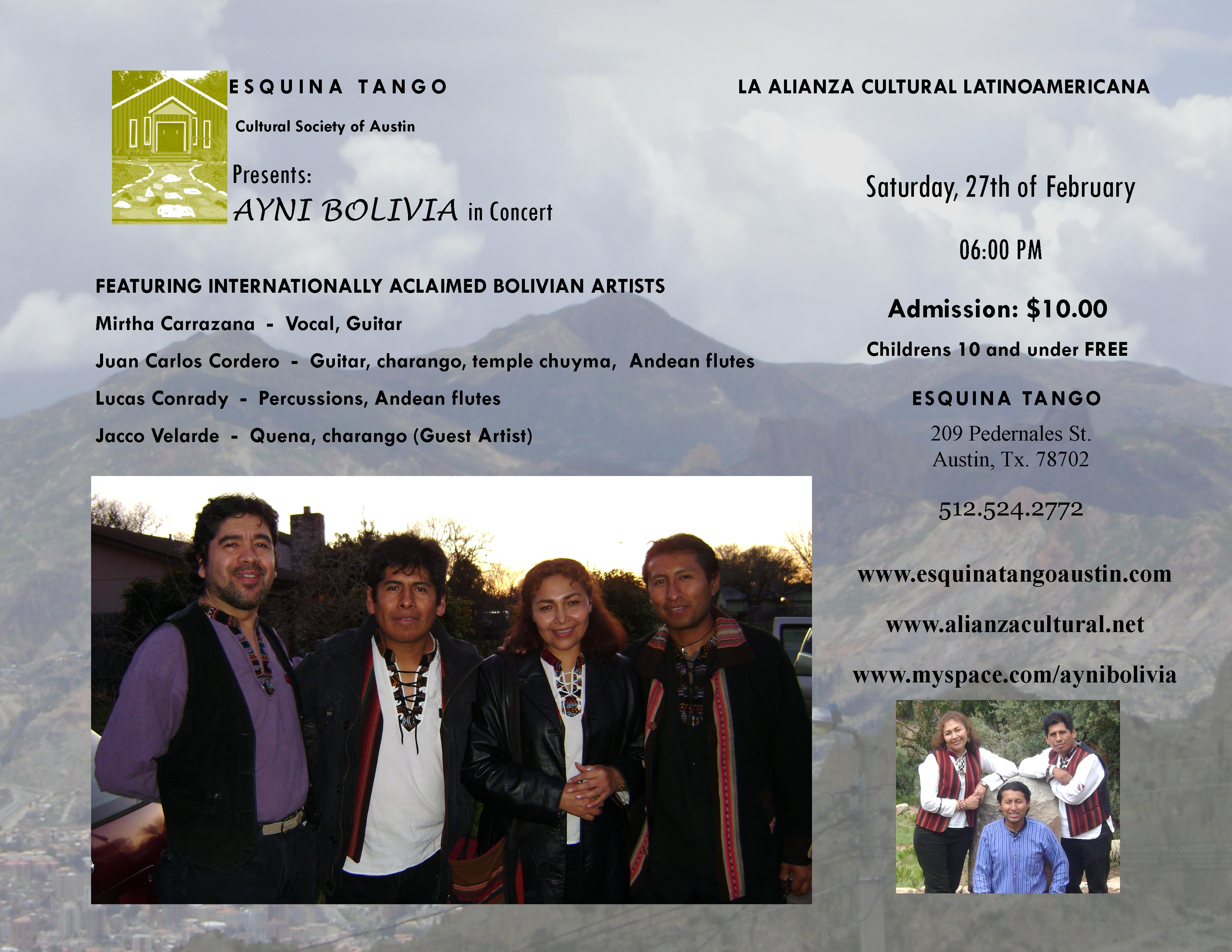Para los que no pudieron asistir al Café con Letras y se perdieron de esta magnífica oportunidad de escuchar la musica Boliviana de Ayni-Bolivia con el virtuosismo en la guitarra de Juan Carlos Cordero y sus compañeros músicos de gran calidad. La Alianza Cultural Latinoamericana en colaboracion con Esquina Tango ponen a su disposición otra oportunida de disfrutar de esta música tan necesaria.