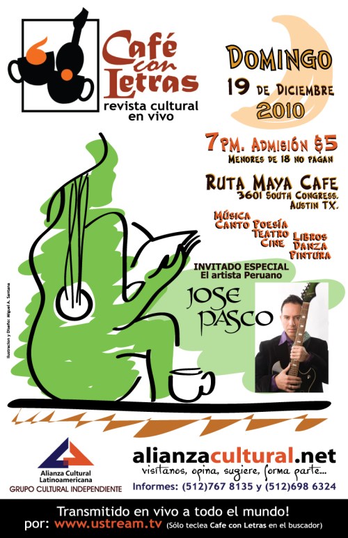 La Alianza Cultural Latinoamericana, se complace en invitarlos a El Cafe con Letras de diciembre, nuestro ultimo evento del año 2010, en el cual reuniremos a una buena muestra del talento latinoamericano de Austin que entre canciones, poemas, pinturas, dramatizaciones y cortos cinematograficos, celebramos la riqueza cultural de nuestros pueblos.