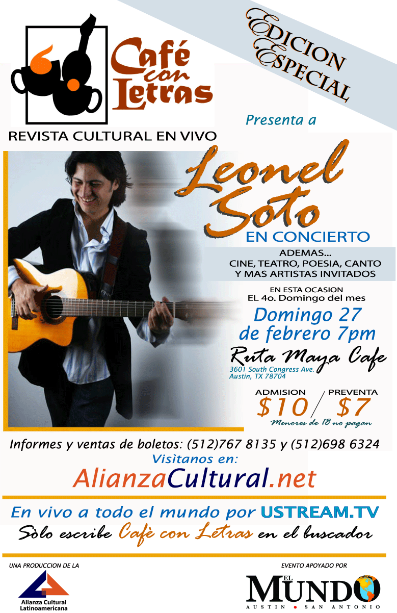 Los invitamos a asistir a la edición de Febrero de Café con Letras, recuerden que por esta unica ocasión, el evento se realizará el cuarto Domingo del mes y no en el tercer Domingo como es costumbre, asi que marquen sus calendarios para el Domingo 27 de Febrero para participar de este evento especial donde presentaremos al cantautor Mexicano Leonel Soto, que en su gira por los Estados Unidos 2011 pasará por Austin en Febrero.