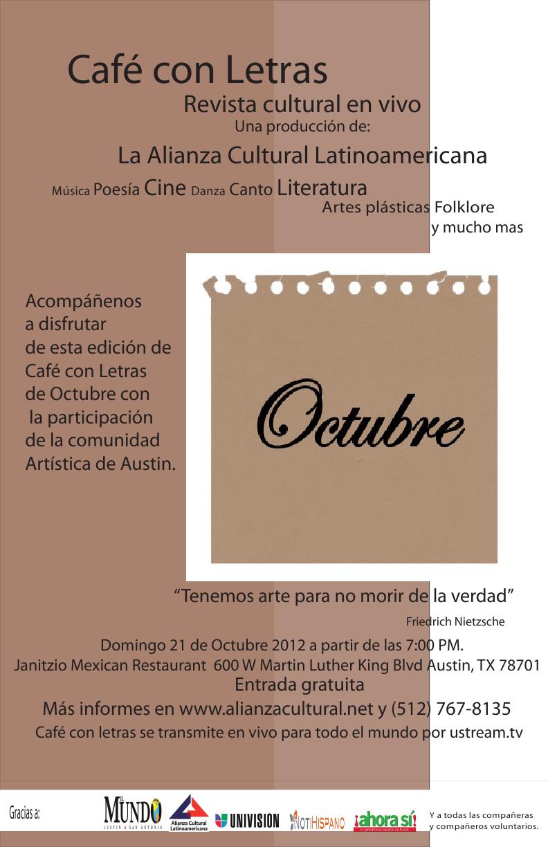 Los invitamos al evento cultural mensual que organiza la Alianza Cultural Latinoamericana, «Café con Letras» nuestra cita con la literatura, la musica y las tradiciones mas al sur de la frontera, en donde el nombre americano nos incluye a todos y abraza un torrente de tradiciones tan diversas como fascinantes.