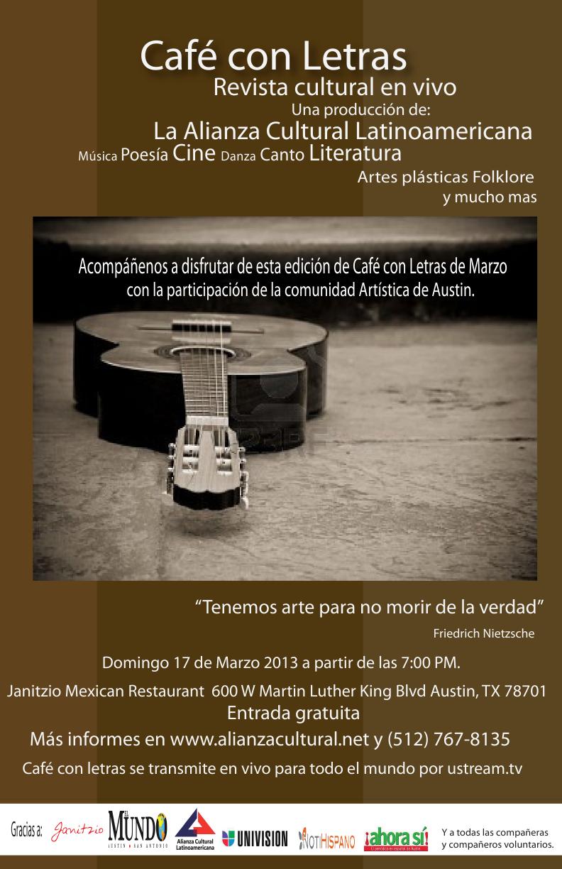 Los invitamos al Cafe con Letras de Marzo 2013, un espacio abierto a los artistas que trabajen en expresiones artisticas de Latinoamerica para que muestren su trabajo a un publico educado e interesado en escuchar. Estos trabajos comprenden desde la poesía, la música, danza hasta el teatro. La entrada es libre y gratuita.