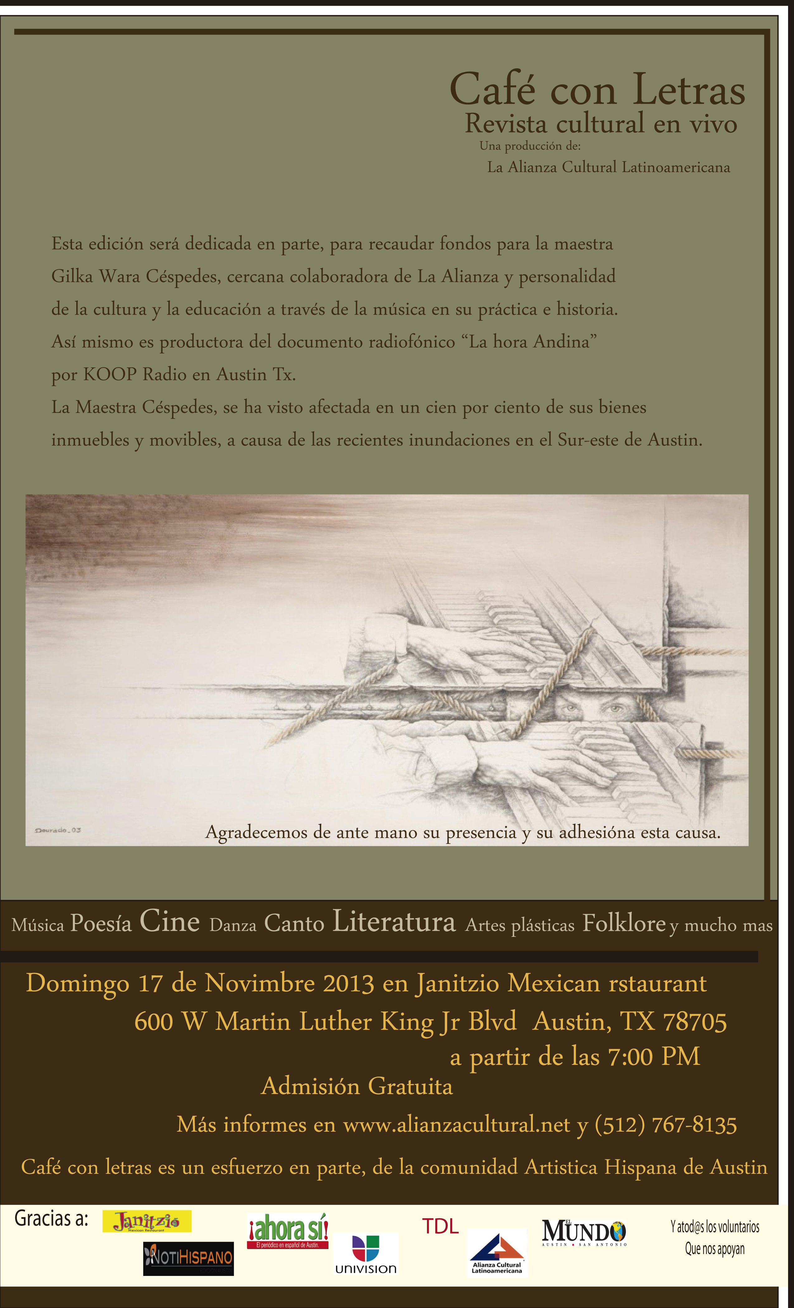 En la edicion de Noviembre 2013 de Cafe con Letras, la dedicaremos de forma especial para recolectar una ayuda económica para la maestra Gilka Céspedes activa colaboradora de la Alianza Cultura y quien perdiera muchas de sus pertenencias incluyendo graves daños a su vivienda debido a las recientes inundaciones en el sureste de Austin.