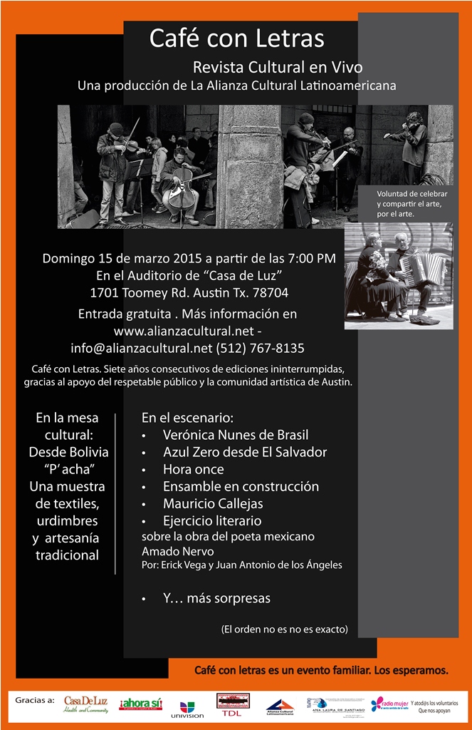 Justo antes que incie la semana de SXSW Café con Letras toma su espacio mensual presentando el arte de nuestro continente americano. Una edición de lujo que promete sorprendernos nuevamente en un evento que es una tradición y valuarte de la comunidad hispanoamericana de Austin.