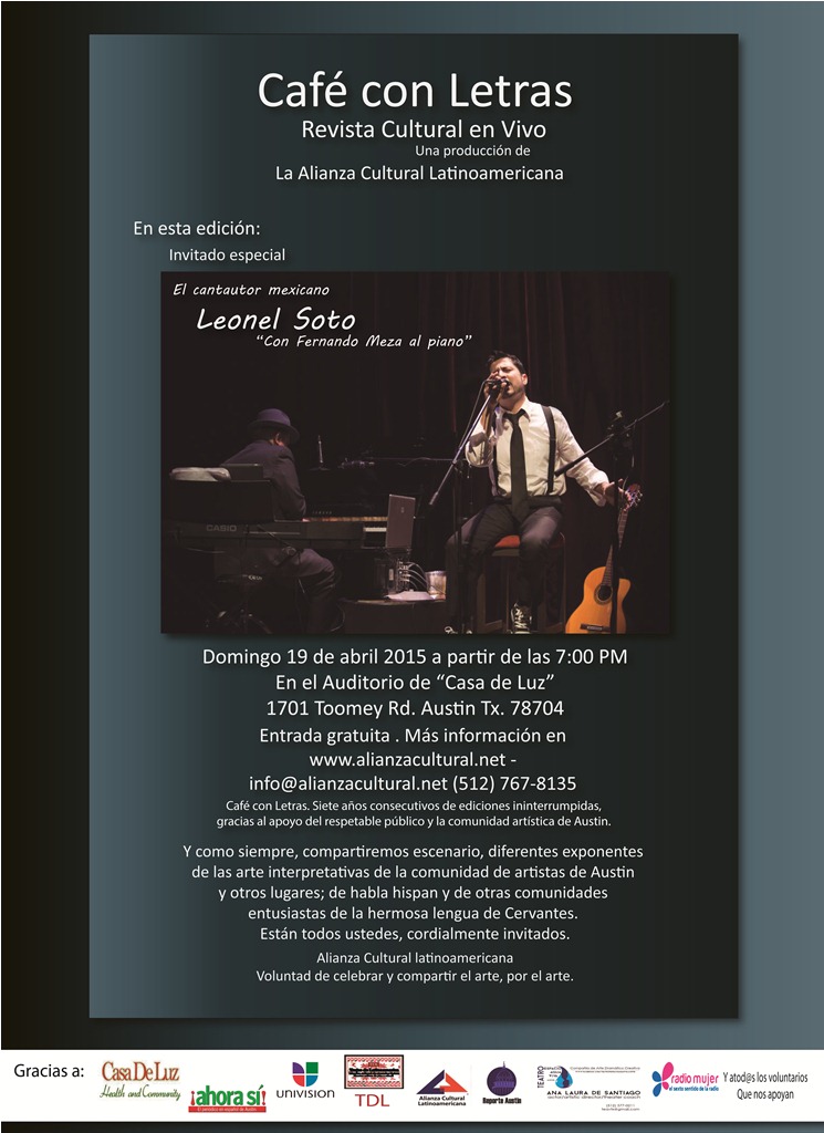 El excelente cantautor mexicano Leonel Soto regresa a Austin TX y será parte de nuestro evento mensual «Café con Letras». En esta ocasión viene acompañado con el pianista Fernando Meza como parte de su gira por los Estados Unidos. Para aquellos que conocen el trabajo de Leonel Soto en el escenario, saben que es un artista de gran valía, tanto en sus composiciones como en su calidad interpretativa.