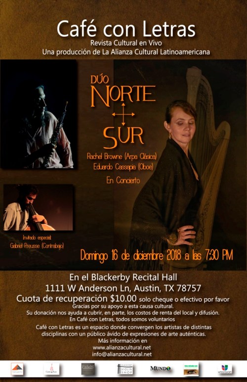 Café con Letras se complace en presentar este próximo domingo 16 de diciembre, al dúo Norte Sur. Rachel Browne (Arpa Clásica) y Eduardo Cassapia (Oboe) quienes nos ofrecerán un concierto que ellos han nombrado “Cruz del Sur”, para el que han escogido piezas del repertorio popular de Latinoamérica, y obras propias. En esta ocasión, se une como contrabajista el músico brasileño Gabriel Preusse para formar esta triada de músicos internacionales de gran nivel. No se pierdan este concierto con el que cerramos el ciclo 2018. Como cada Café con Letras, este también, será especial e inolvidable. Les esperamos.