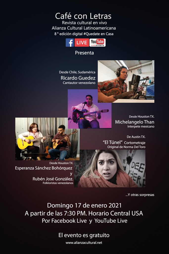 Esta edición digital de Café con Letras se realizará el domingo 17 de enero 2021 a partir de las 7:30 Hora del Centro USA por la página de Facebook de la Alianza Cultural Latinoamericana y también se transmitirá por nuestro canal de YouTube en el cual contaremos con el talento de los siguientes artistas: