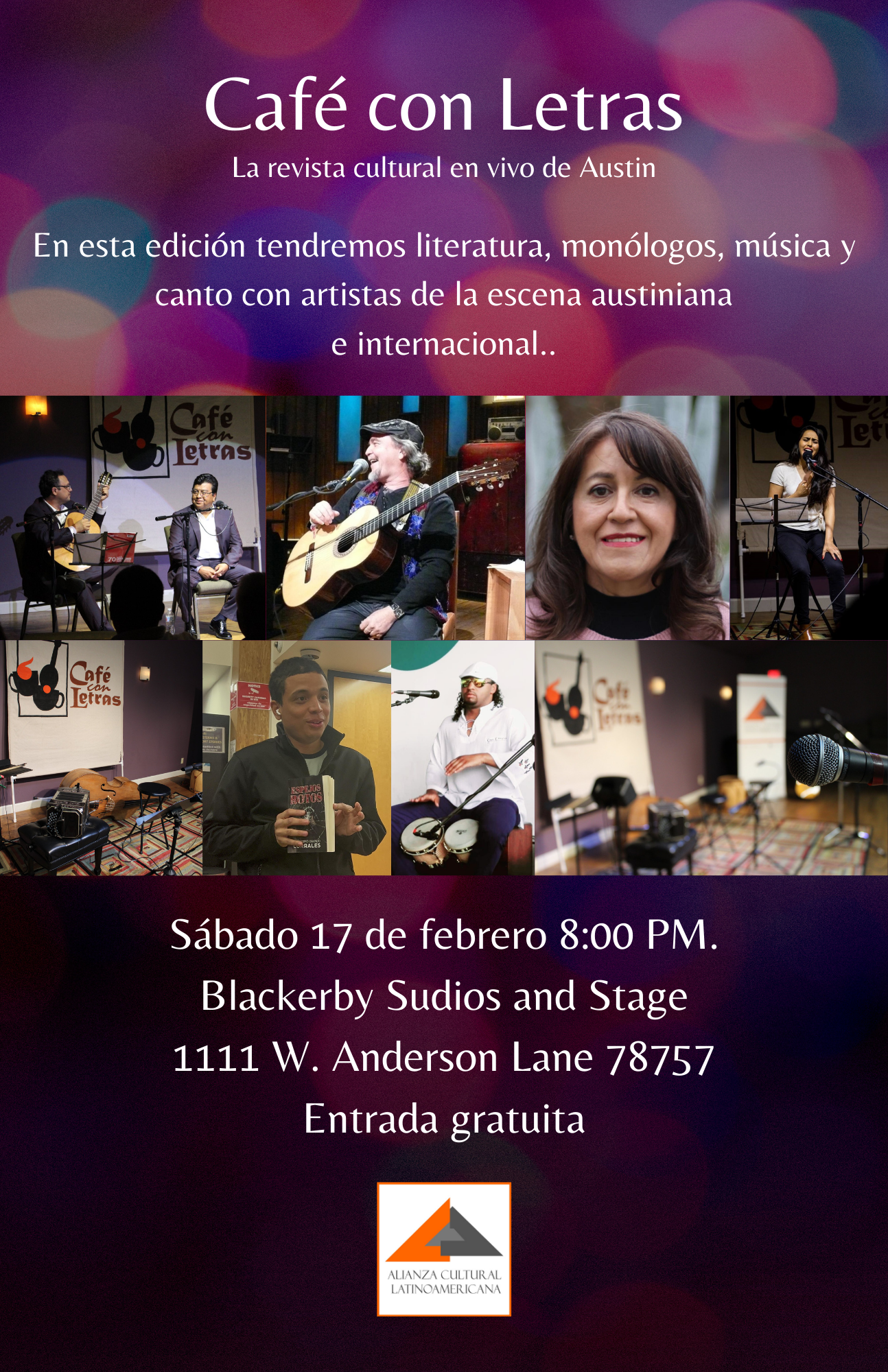 Queridas amigas y amigos de Café con Letras. Están cordialmente invitados a nuestra primera sesión del año. La cita es este sábado 17 de febrero. Será una sesión muy diversa y especial, con la presentación de artistas locales e internacionales, que estarán celebrando nuestra cultura a través de la canción, la música y la literatura.
