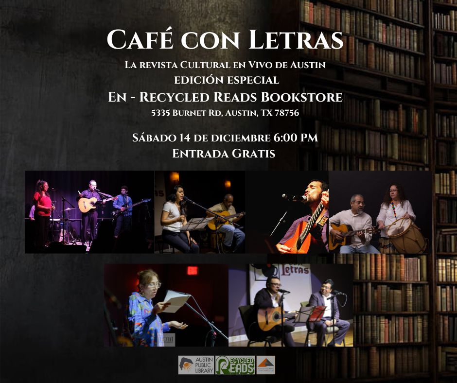 Recycled Reads es una biblioteca y librería, sin fines de lucro, administrada por Austin Public Library, que ofrece libros usados por donación y organiza eventos de poesía y música. En esta edición, nos honra al elegirnos para cerrar el ciclo 2024.