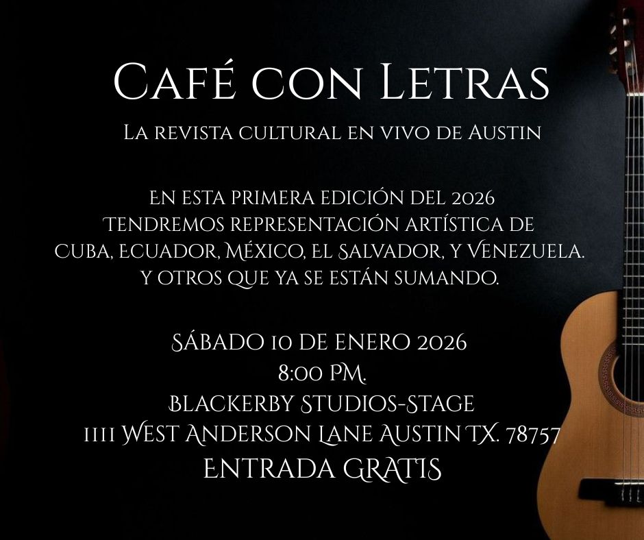 Tendremos representación musical y literaria de Cuba, Ecuador, México, Texas, El Salvador, Venezuela y otros que ya se están sumando. Esperamos contar con su presencia, que es la razón de este, ya legendario evento mensual para celebrar el arte, por el arte. Les esperamos.