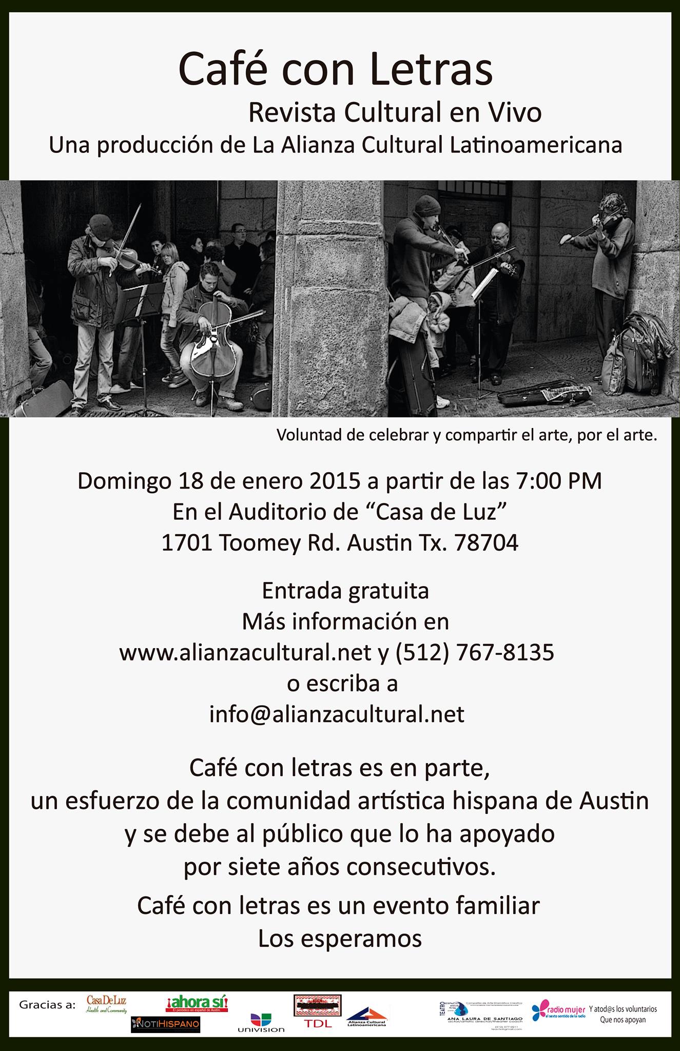 Mas información: http://www.alianzacultural.net o al teléfono 512 767-8135